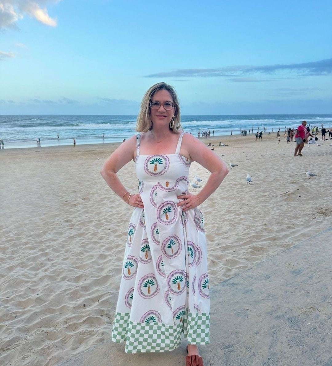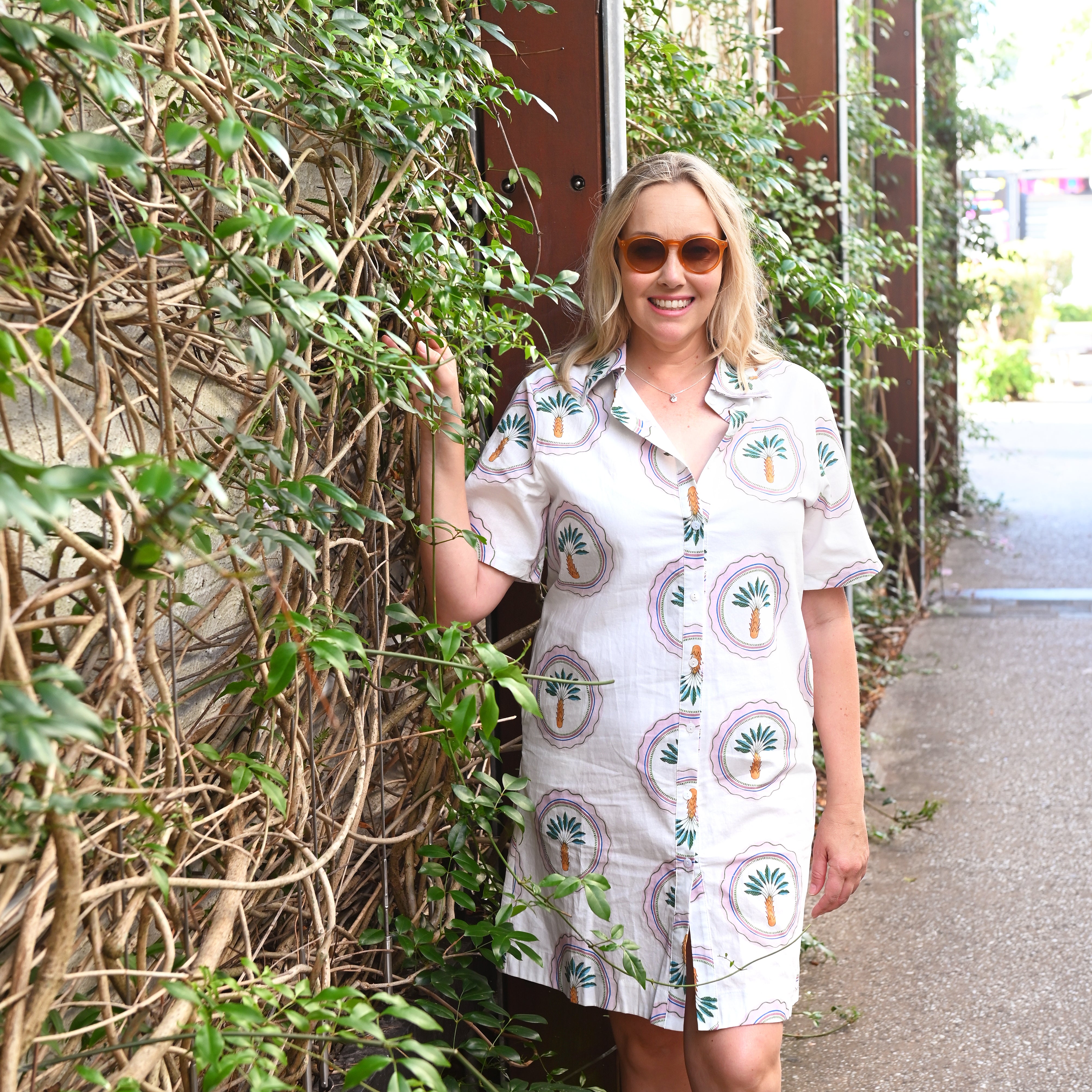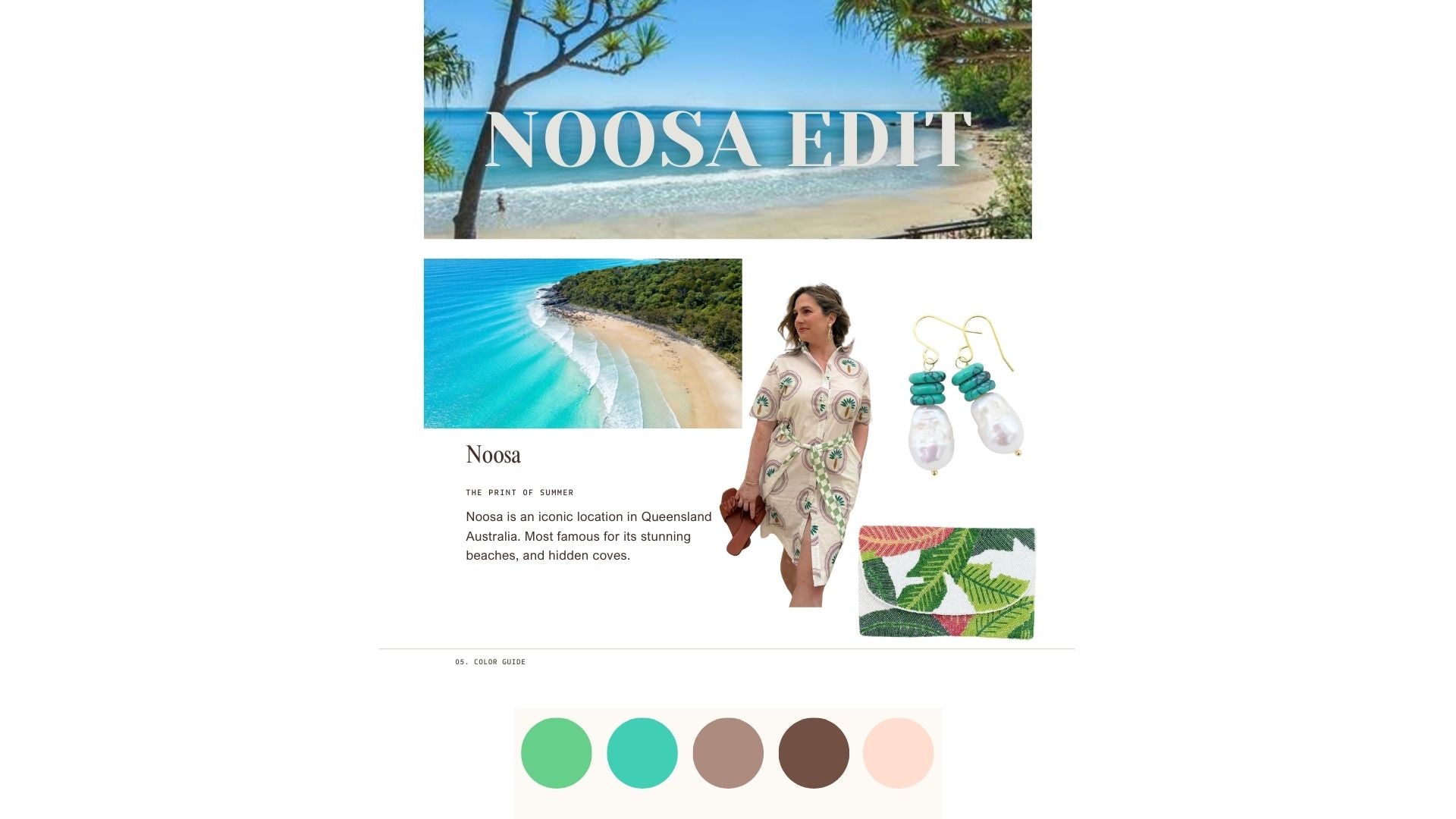 Noosa is located in Queensland Australia. Noosa has stunning beaches, with bright blue water, hidden coves, and lush greenery. This collection takes inspiration from the location, as can be seen the dress features a unique print with pops of green.