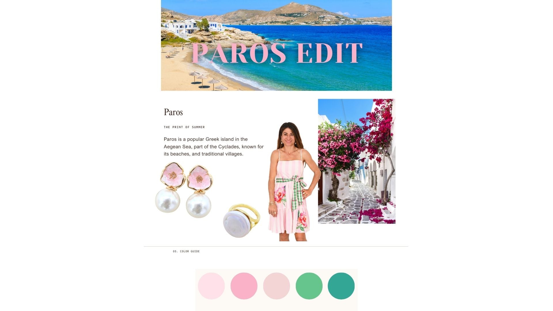 Paros isa popular Greek island, known for its beautiful sandy beaches, and traditional whitewashed villages. Walking around in alleys you will find vibrant, pink Bougainvillea. This is where the gorgeous pink flowers that can be seen on the dress were inspired from.