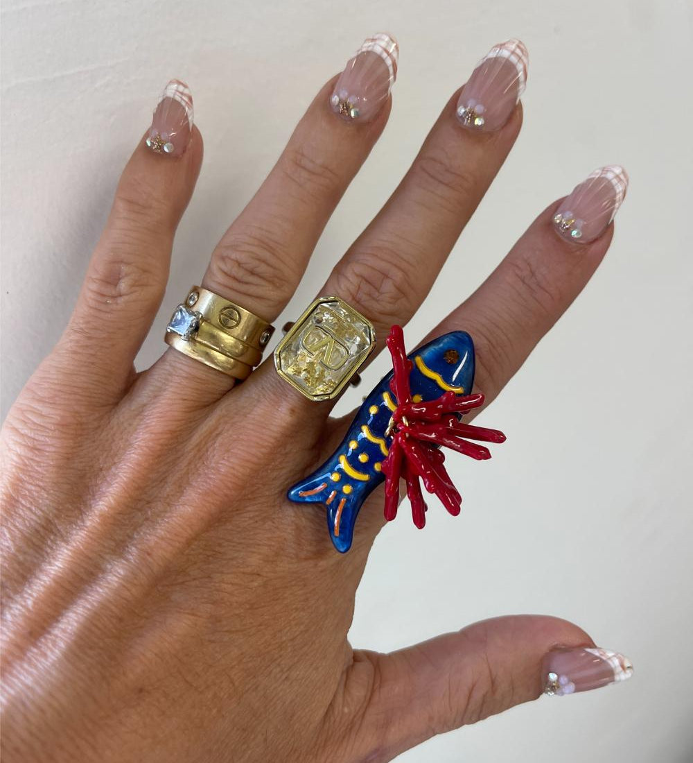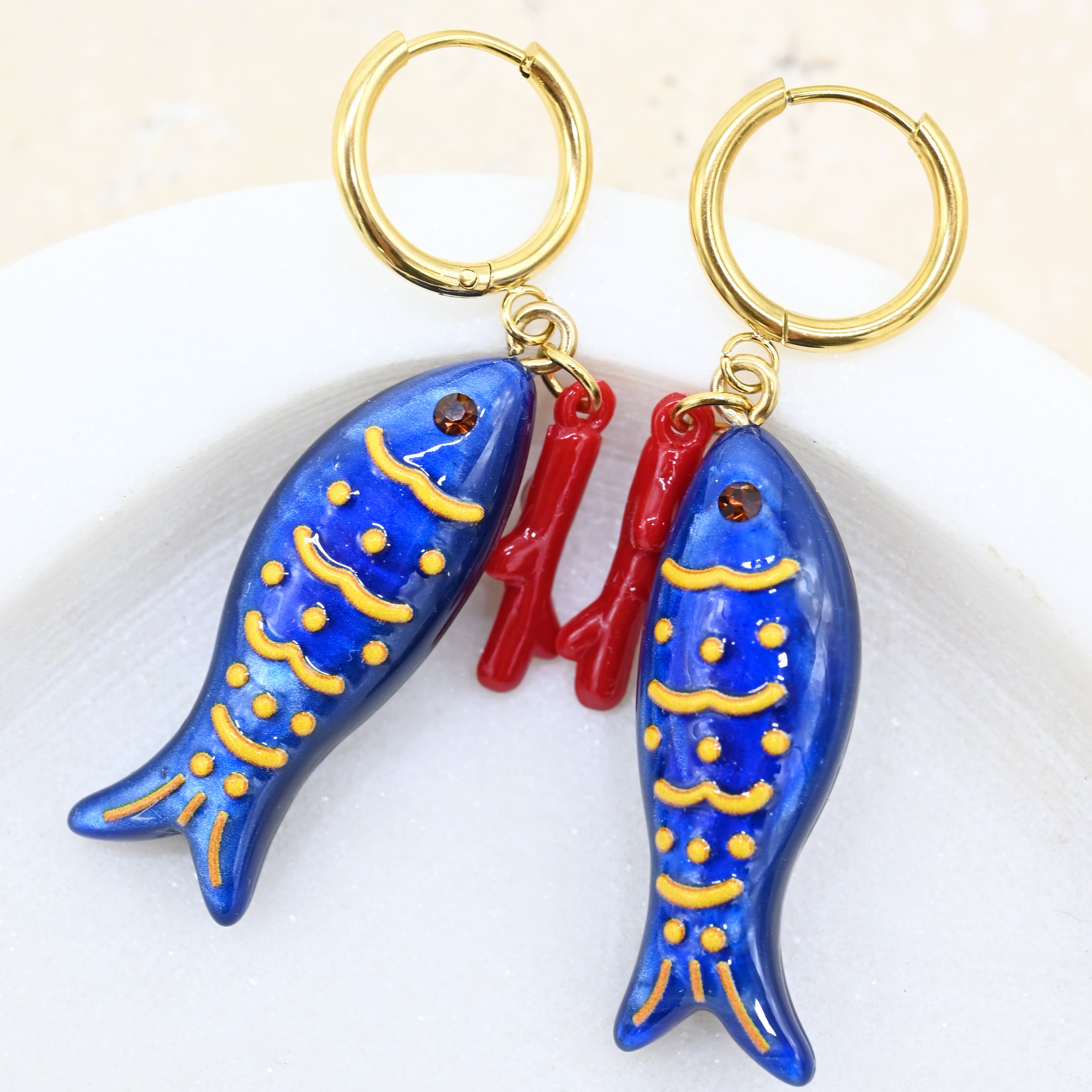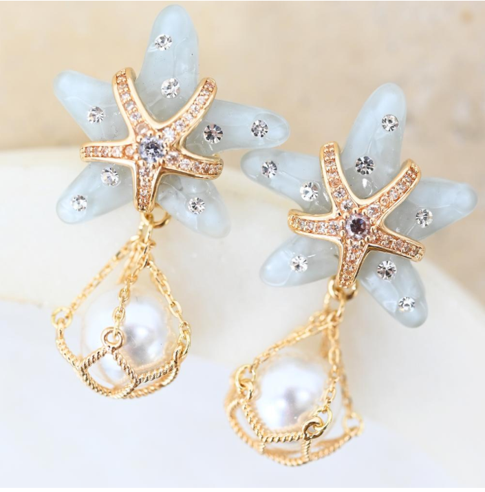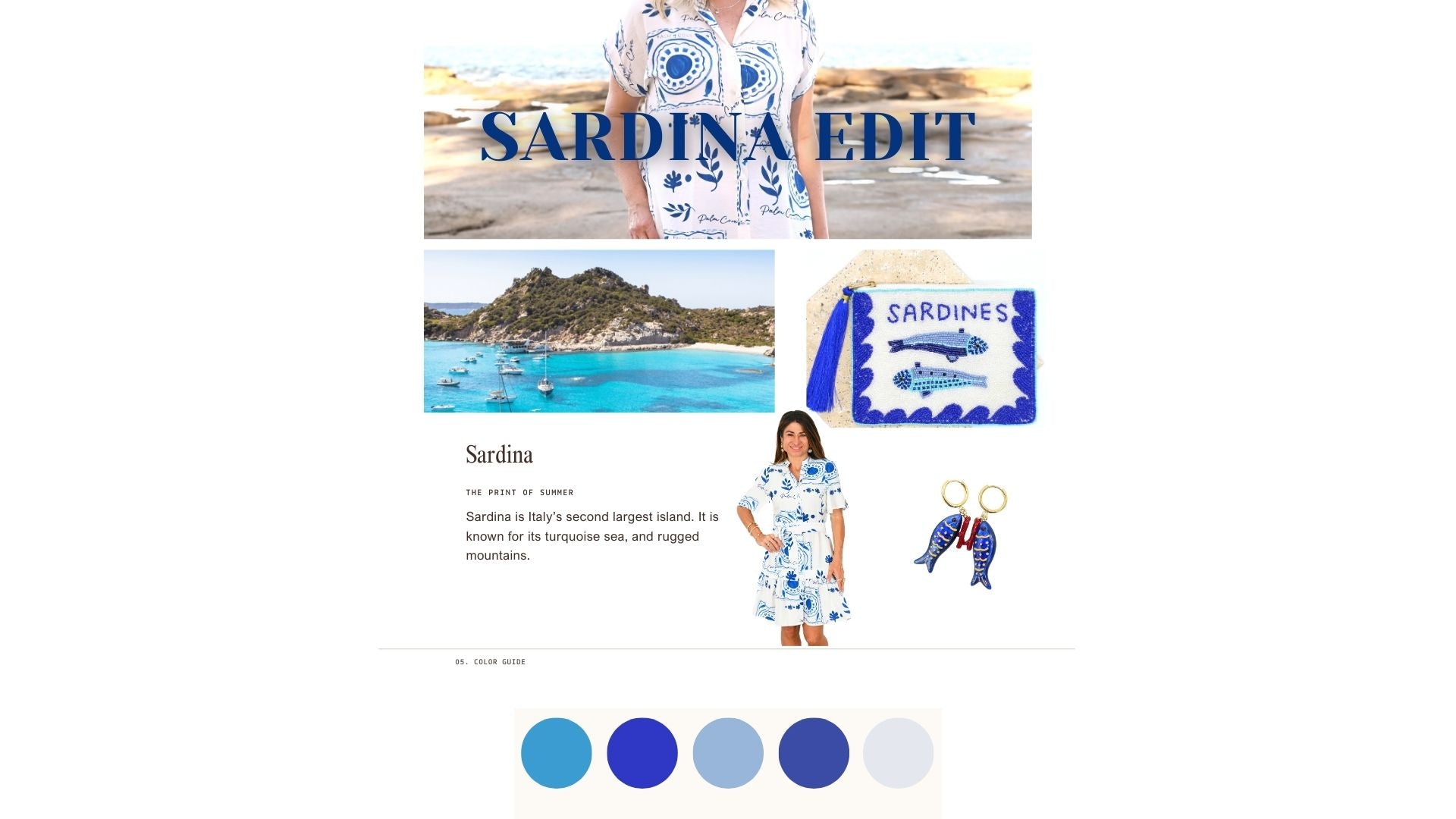 Sardina is an island in Italy, known for its stunning turquoise waters, white sand beaches, and rugged mountains. The Sardina collection embodies the island, with stunning blues, and unique prints. The clutches and jewellery also feature sardines.