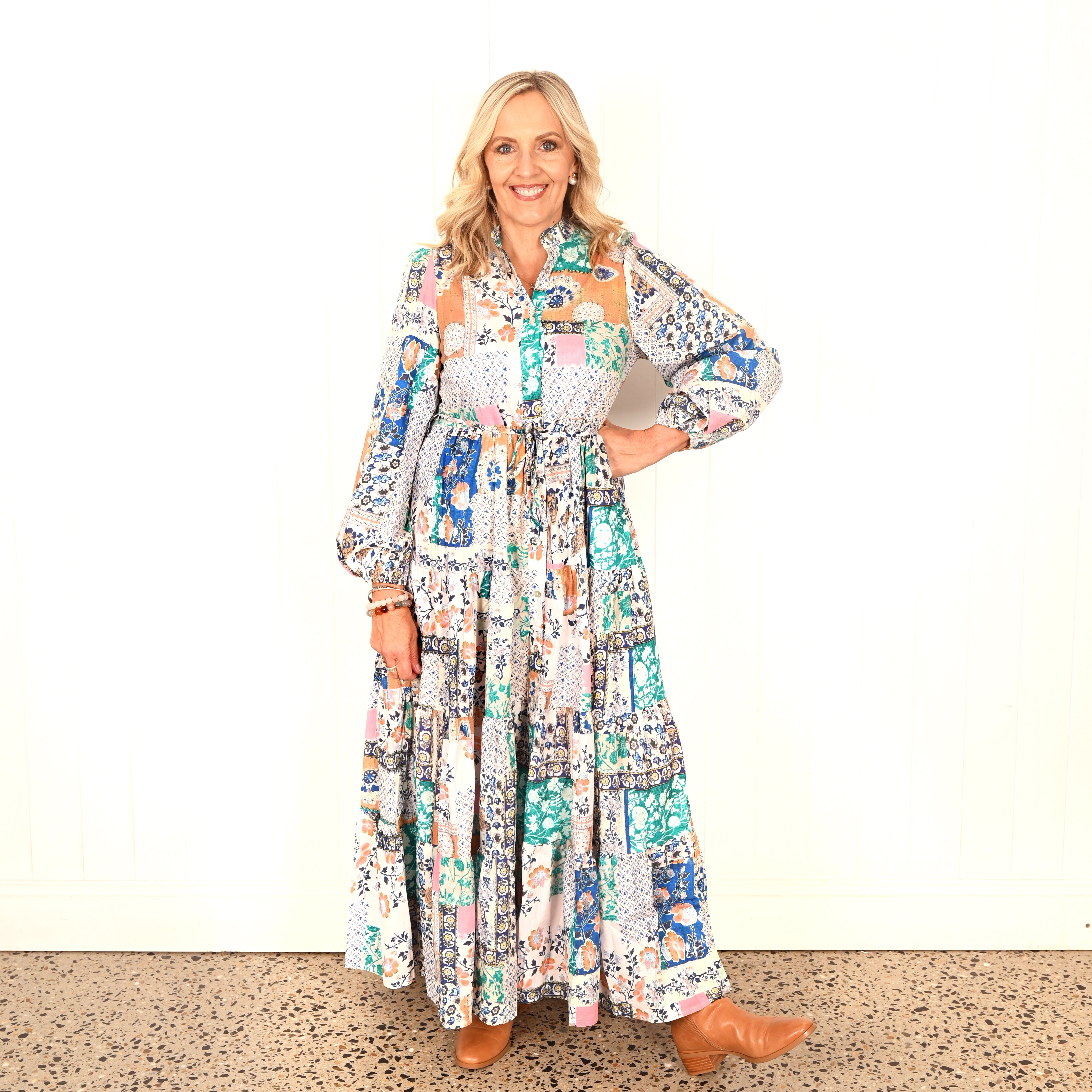 A gorgeous print with a variety of blue and green throughout. Made from 100% Cotton The Alyssa Dress is light and comfortable.