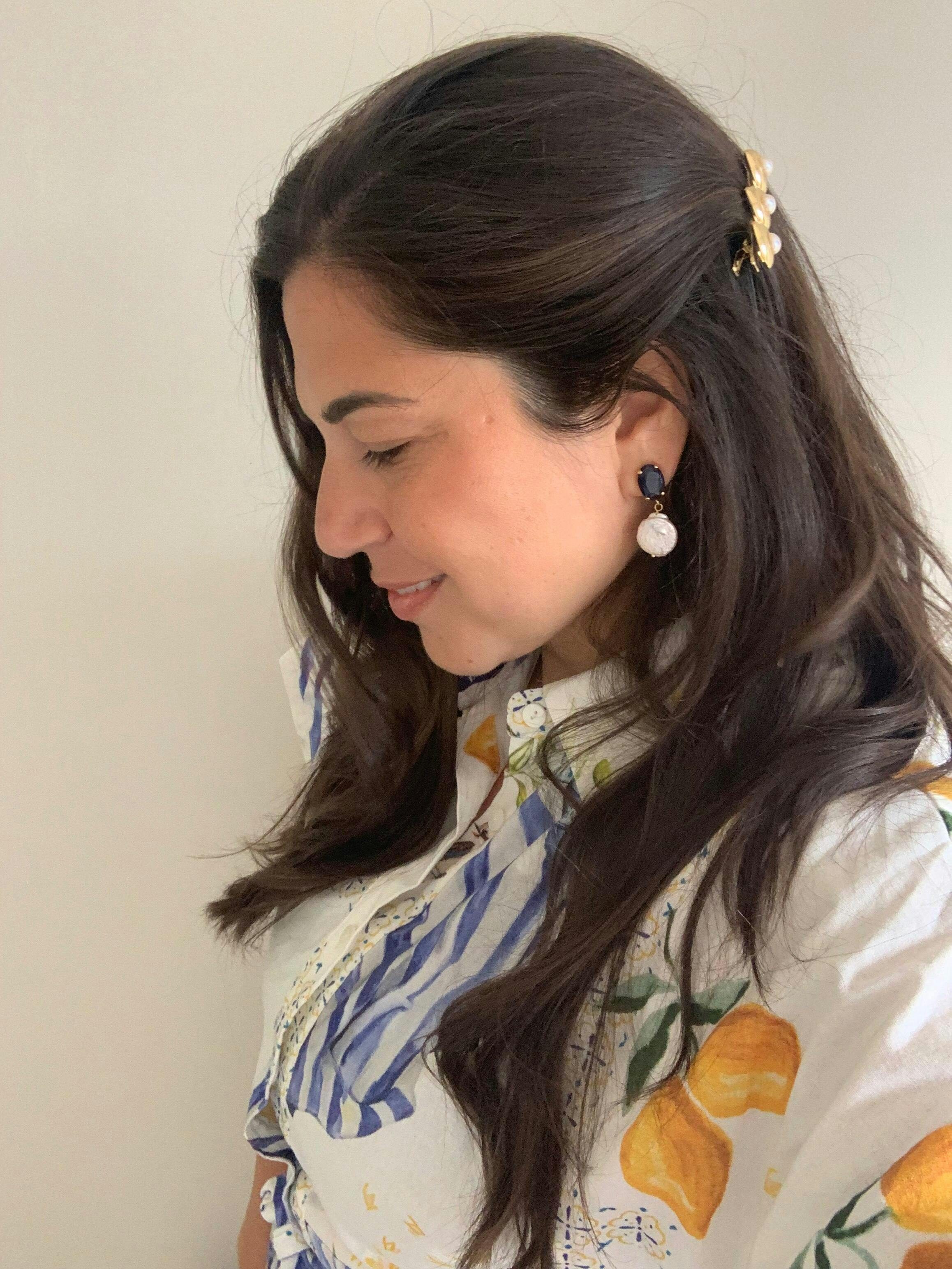 The Aria Earrings feature a gorgeous blue stone and a drop pearl.