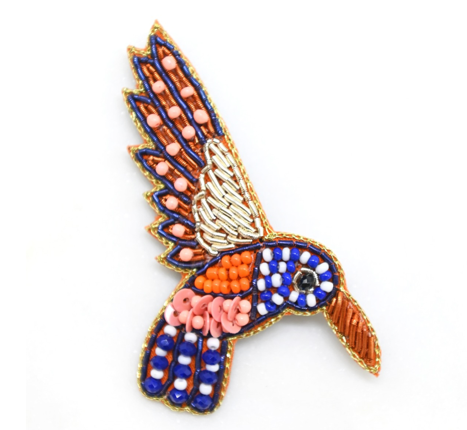 The cutest brooch yet! The Beaded Hummingbird Brooch. Featuring orange and blue beads.