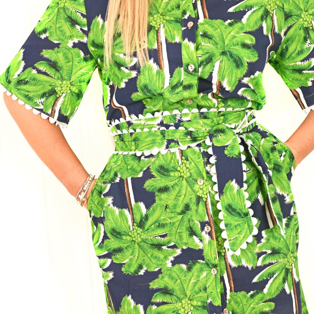 Bold, breezy and beautifully tropical — the Caribbean Cruise “Adele” Dress is your new island-inspired staple. With its deep navy base and vibrant green palm print, this dress brings instant holiday energy to your everyday wardrobe.