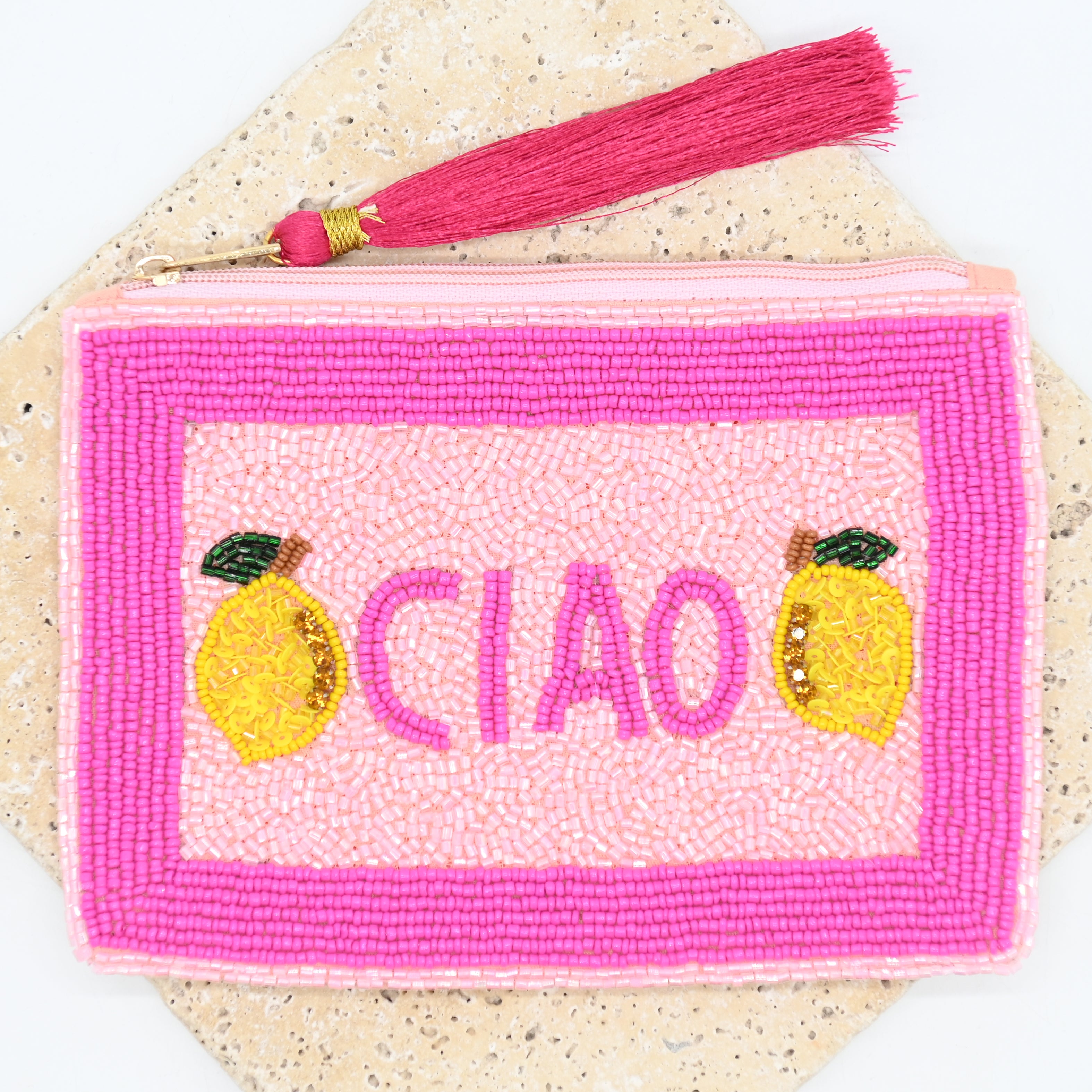 Ciao Beaded Clutch, features pinks, and yellow lemons.