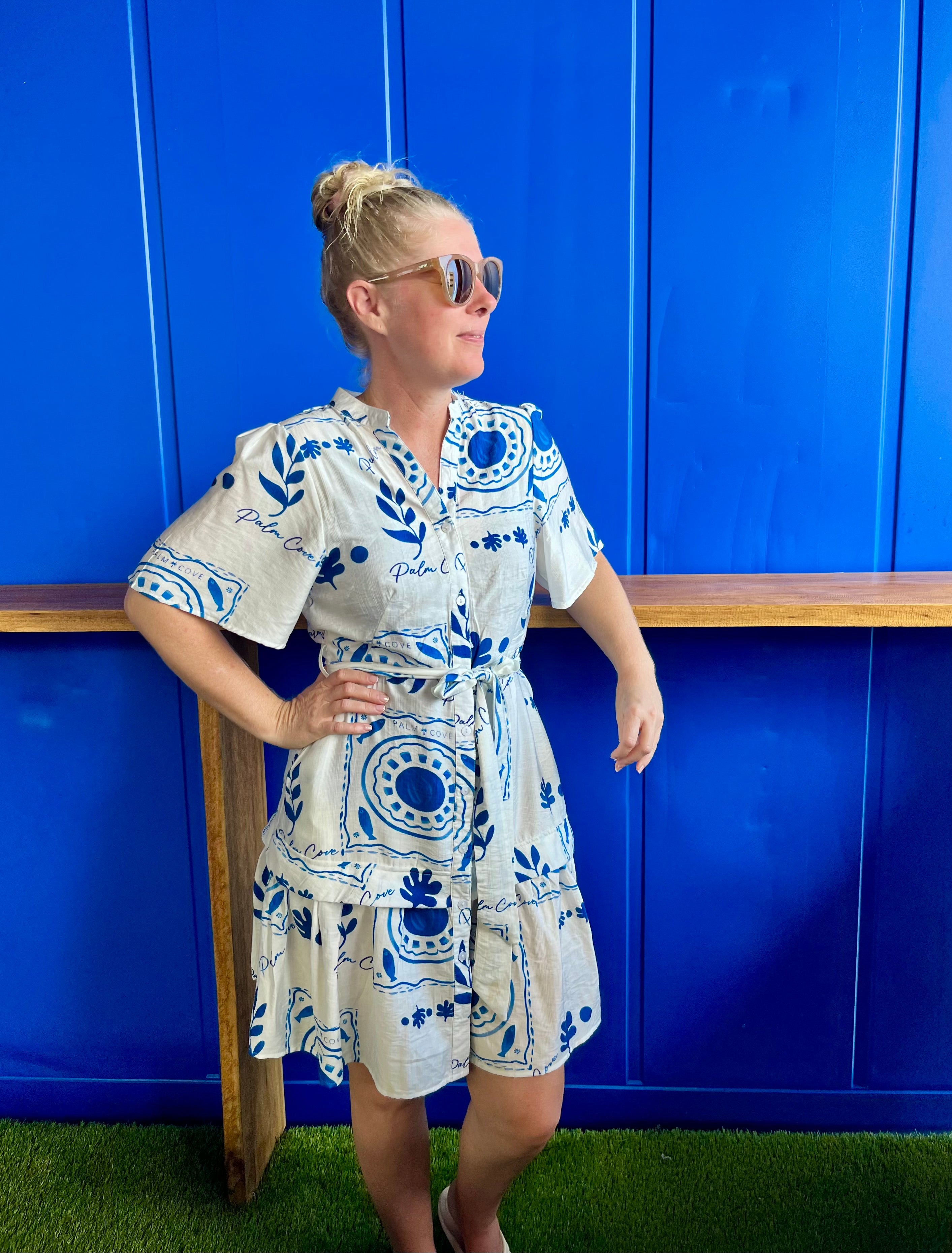 Corfu "Pheonix" Dress is the perfect dress for any event, it features the iconic Palm Cove print in blue.
