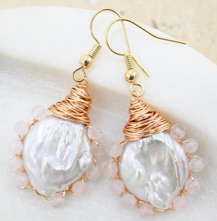 Stunning earrings with a pearl centre, surrounded by baby pink beads.