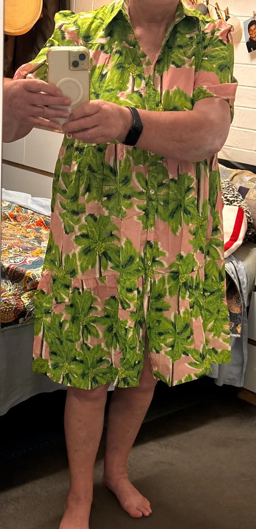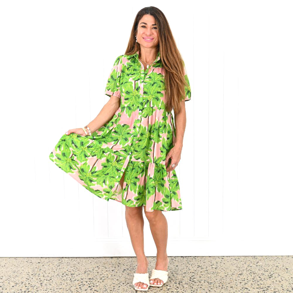The gorgeous, Palm Royale "Ellie" Dress. A stunning baby pink, featuring a lush, green palm print. This dress is great for summer.
