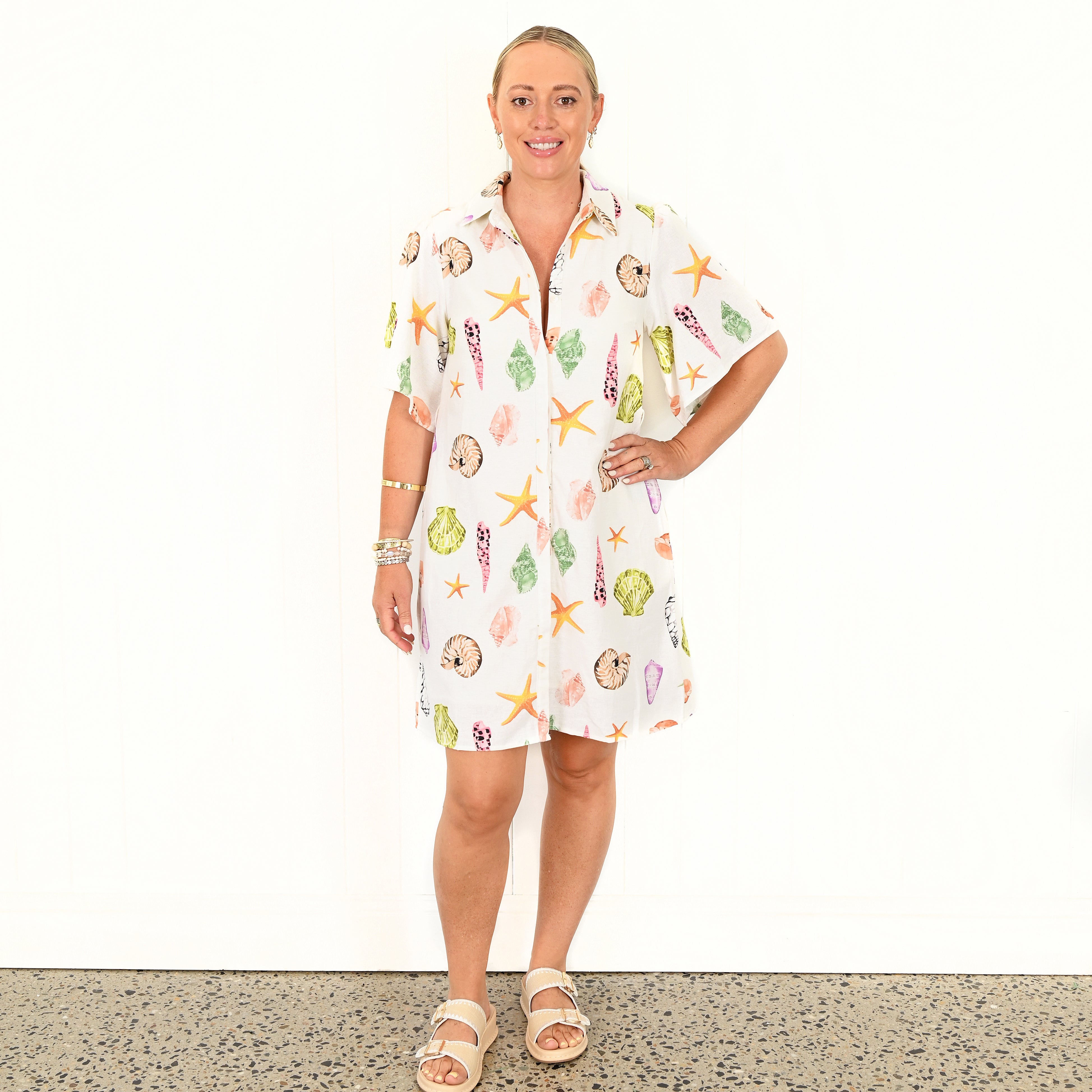 The Treasure Island "Aria" Dress is a wardrobe must have. It is a flattering style, that features a range of coloured shells on a white base.